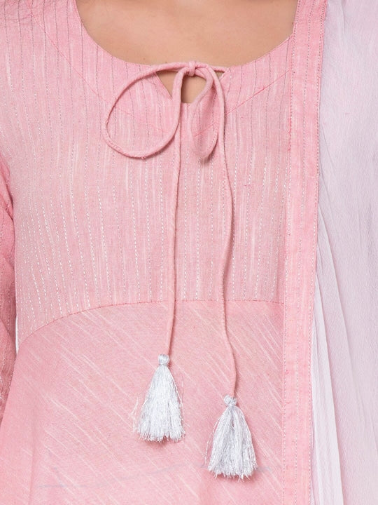 SQ SANGANERI KURTI Women Pink & White Pure Cotton Kurta with Trousers & Dupatta